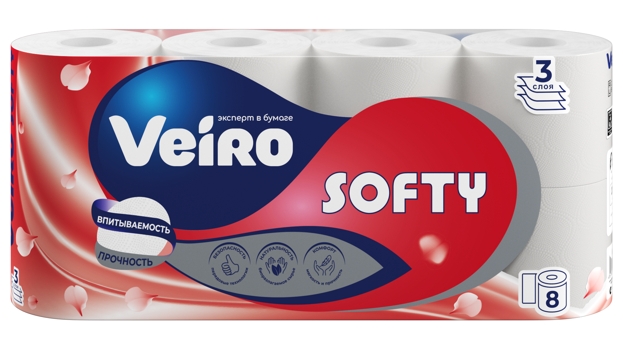 Veiro Softy – это 3-слойная премиальная туалетная бумага с увеличенной длиной рулона, которая сочетает нежность и практичность.